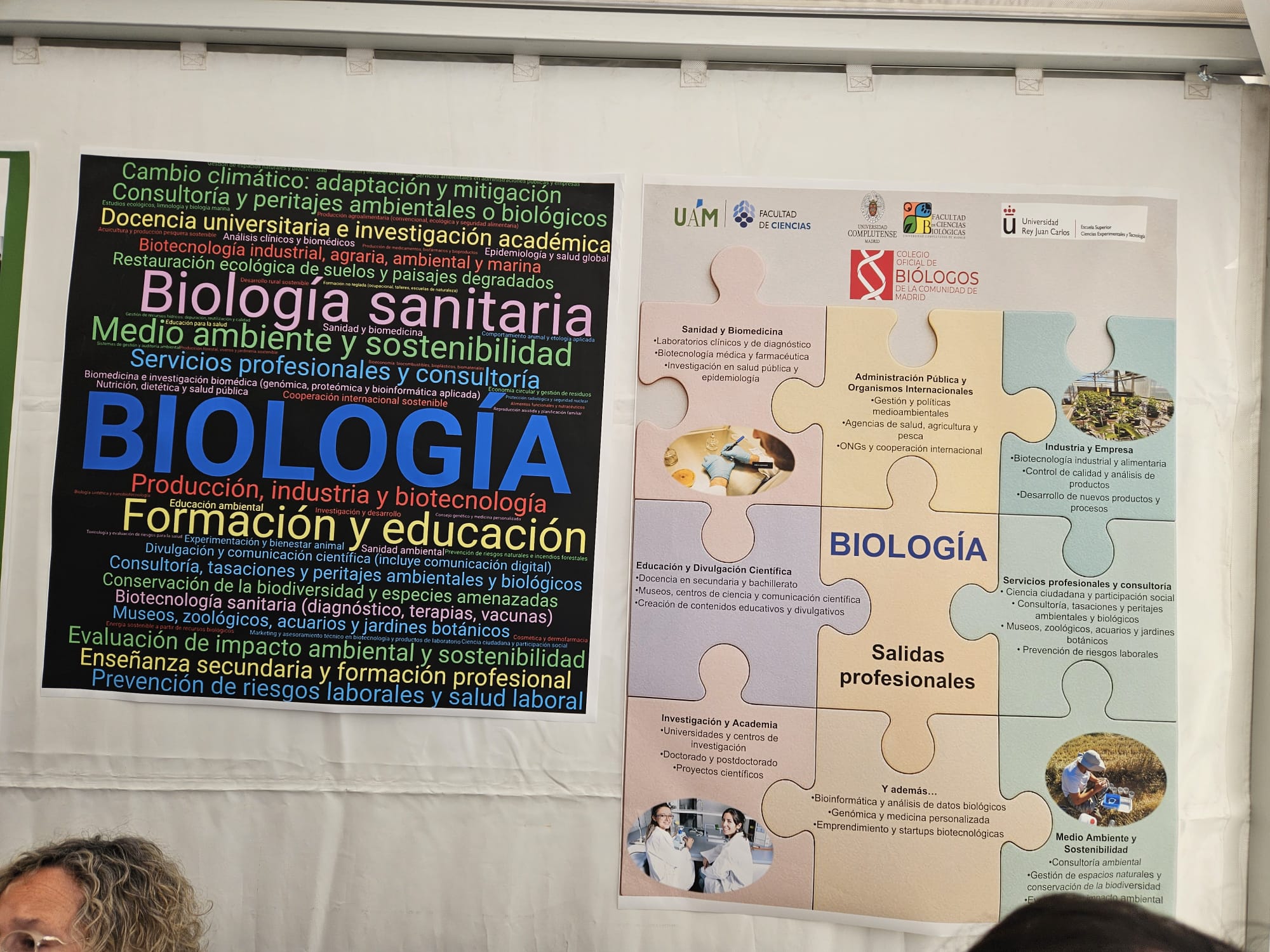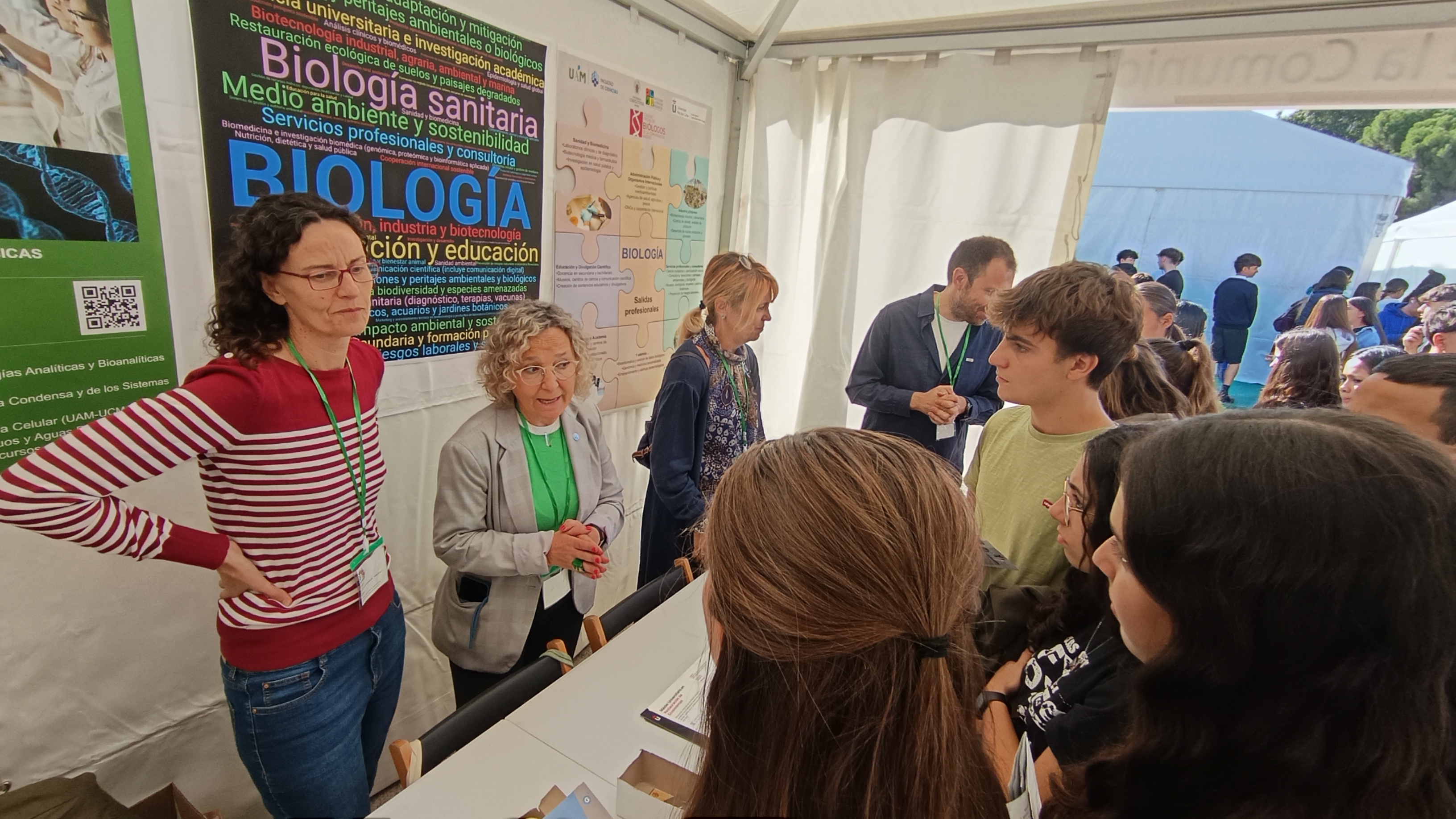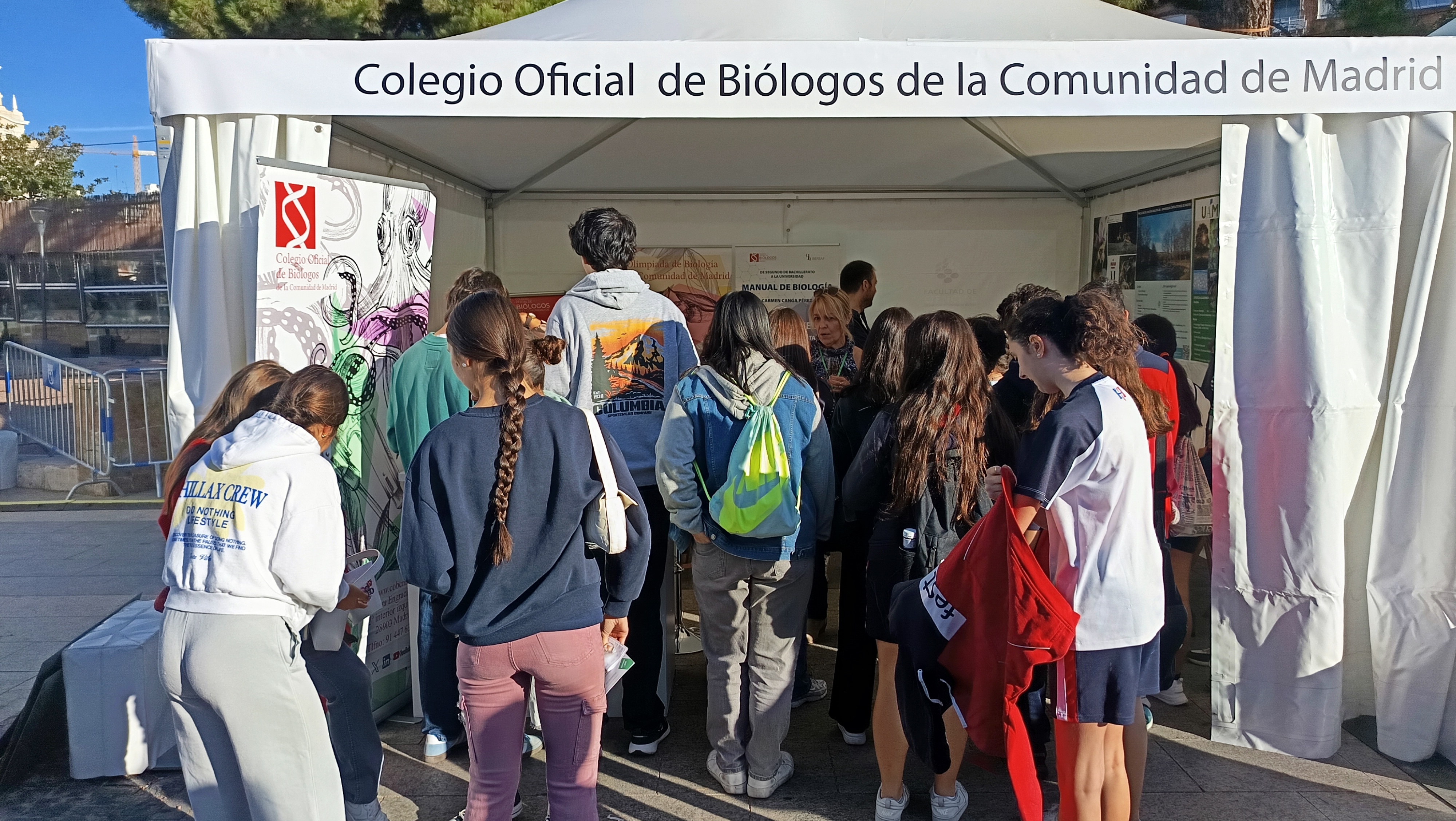 La Facultad de Ciencias Biológicas de la UCM ha participado en el Día de las Profesiones 2025, la novena edición de esta cita anual de puertas abiertas de los Colegios Profesionales madrileños. Este evento está dirigido a los estudiantes preuniversitarios (4º de la ESO y Bachillerato), universitarios y estudiantes de Formación Profesional, para que puedan descubrir, conocer y conectar con las profesiones a través de los distintos puntos de información de los Colegios Profesionales que estuvieron instalados en la Plaza de Colón. En esta edición participaron destacadas Universidades madrileñas, con representantes de más de 35 profesiones, que celebraron diversas mesas redondas sobre temas de interés, así como cerca de 90 talleres y actividades a lo largo de todo el día.